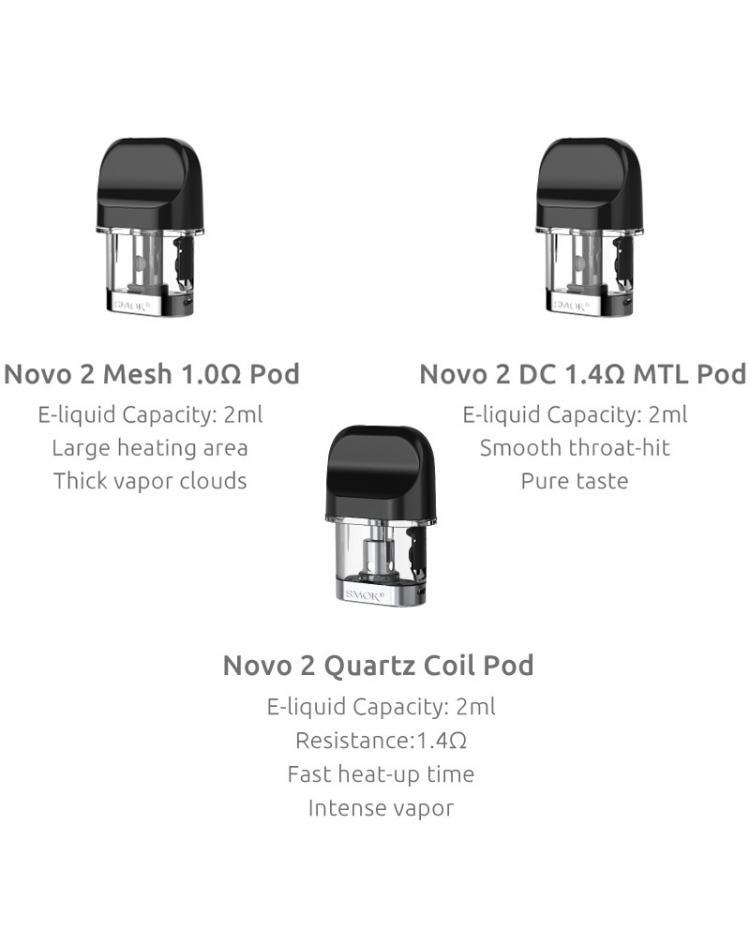 SMOK’un Novo 1 cihazının yükseltilmiş versiyonudur. Dahili 800mAh pil ile çalışır. Her yere yanınızda rahatlıkla götürebileceğiniz mini ve hafif boyutta tasarlanmıştır. Cihazın her iki tarafında hava giriş olukları vardır, buharladığınızda, buharı ve tadın saflığını büyük ölçüde artırabilen çift U şeklinde bir hava akış yolu oluşacaktır. Hava algılama anahtarının yapısı, her nefese değecek şekilde yeniden tasarlandı. Elektrotun etrafında bir oluk olacak şekilde tasarlanmış olup, her yere akacağından endişelenmenize gerek yoktur. LED göstergesi ile farklı ışık renklerine göre cihazın pil durumunu net bir şekilde öğrenebilirsiniz. Dahil edilen kapsülün içinde daha fazla likit buharlaştırmak ve büyük buhar üretmek için çift coil bulunur. NOVO Pod Kartuş ile de uyumludur.
