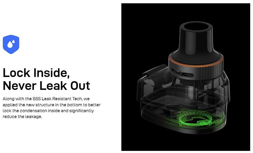 Armour G Pod Kartuşu, çift üst ve üçlü sızdırmazlık özelliğiyle birlikte gelir. Hassas ayarlı üst hava akışı sızıntıyı azaltır. Üstten dolum sistemi kolay kullanım sağlar. Vaporesso Armour G Pod, SSS Sızdırmazlık Teknolojisine sahip olmasının yanı sıra, yoğuşmayı içeride daha iyi hapsetmek ve sızıntıyı önlemek için alt kısımda yeni bir yapı da kullanmaktadır. Vaporesso Armour G Pod Kartuşu 5 ml kapasiteye sahiptir ve Armour G/GS Kit ve GTX Coil ile uyumludur.