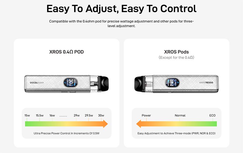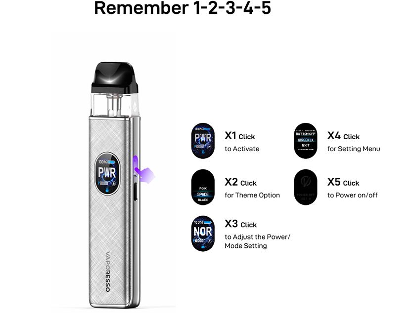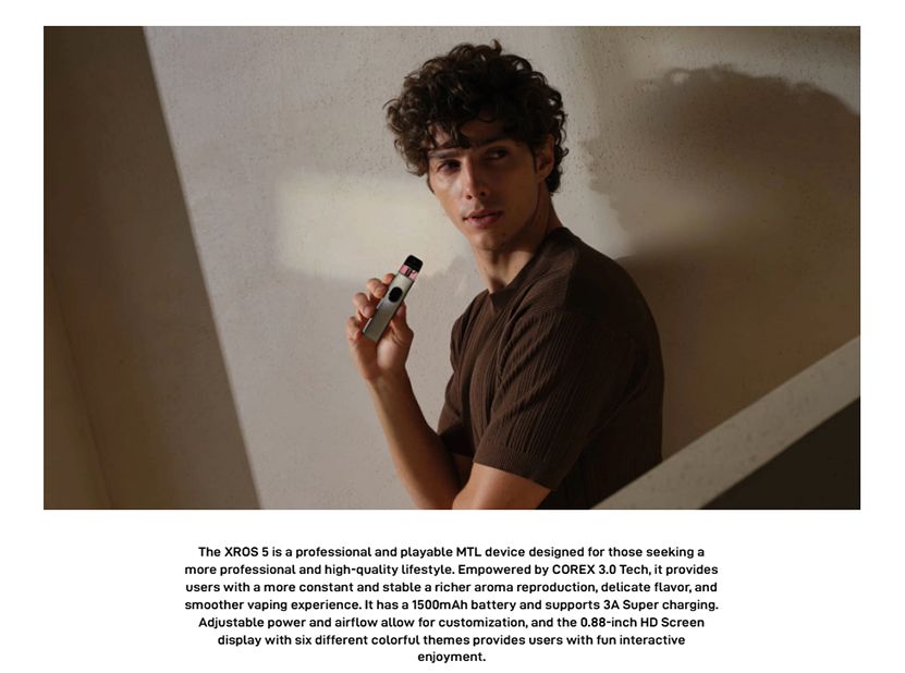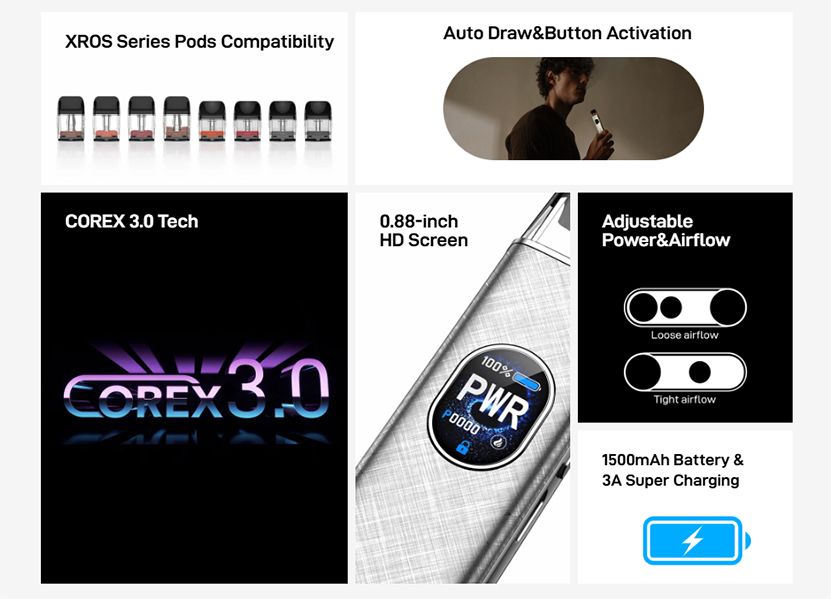 XROS 5 Kit, daha zengin aroma, hassas tat ve daha akıcı bir vaping deneyimi sunmak için COREX 3.0 teknolojisini kullanır. 30W maksimum güç ve 3A hızlı şarj özelliğine sahip dahili 1500mAh pil ile daha uzun süre vaping yapmanızı ve daha az şarj etmenizi sağlar. Daha iyi görsel keyif için büyük 0,88 inç HD ekran ve kullanımınızı özelleştirmek için 6 değiştirilebilir temalı fonksiyon ile donatılmıştır. Ayrıca, yoğun buhar için güç modu, dengeli günlük kullanım için normal mod ve daha akıcı ve uzun süreli kullanım için ECO modu olmak üzere 3 ayarlanabilir çıkış modu seçeneğiniz vardır. Hassas watt ayarı için XROS 0.4Ω Pod ve 3 çıkış modu ayarı için diğer XROS Serisi Pod'larla uyumludur. Ayarlanabilir hava akışı ile tasarlanan bu cihaz, MTL'den RDL deneyimine kadar zahmetsiz kontrol sağlar. Otomatik çekim ve düğme aktivasyon tasarımı, kullanımını kolaylaştırır.