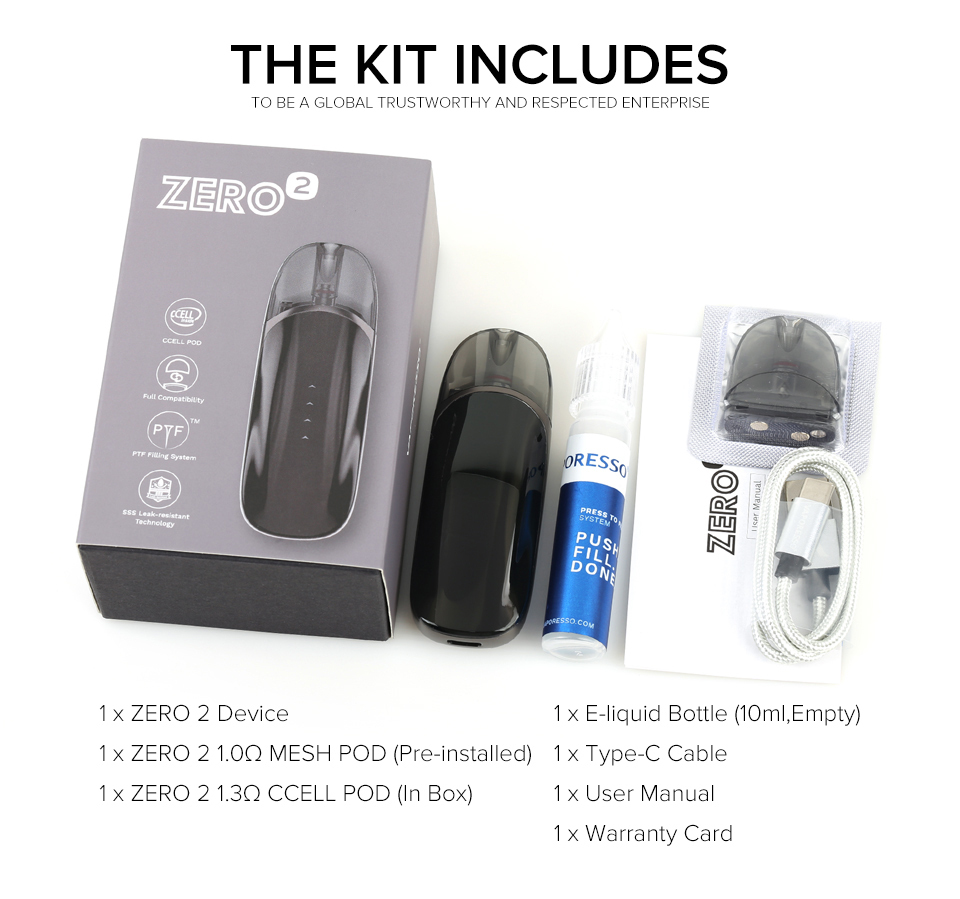 Vaporesso Zero 2 Pod Mod Kit – 800 mAh, Zero 2 Kit, Zero Kit'e göre daha rahat ve ele uygundur. 800mAh dahili pile sahiptir ve fütüristik aerodinamik gövdeye sahiptir. 1.0ohm Mesh Pod ve 1.3ohm CCELL Pod ile paketlenmiştir, size harika bir buhar deneyimi sunar. Ayrıca tekrar doldurmayı kolaylaştırmak ve sızıntıyı önlemek için PTF (press-to-fill) dolum ile tasarlanmıştır. Ve SSS-Sızıntıya Dayanıklı Teknoloji, likiti sıkıca içeride kilitleyecektir. Zero 2, Type-C tipi şarjı destekler ve 3 ml likit kapasitesine sahiptir. Zero Pod Kartuş ile uyumludur.